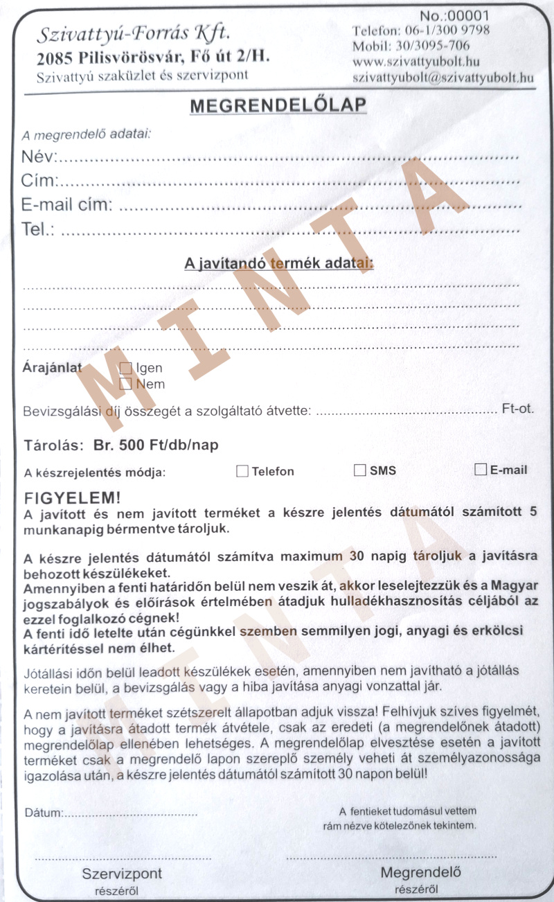 - A készülékek átvételekor üzletünkben kollégáink egy szervizes Megrendelő füzetbe vezetik fel a leadó személy nevét és telefonszámát, a szivattyú adatait, az Önök által jelezett problémát és készpénzben átveszik a bevizsgálási díjat, mely (szivattyú teljesítményétől függően) jelenleg 10 000 - 28 000 Ft (*) között mozog A Megrendelő lap egyik példánya Önöknél marad. Ennek jobb felső sarkában található az a szám is, melyre később, az átvételkor is hivatkozniuk szükséges.